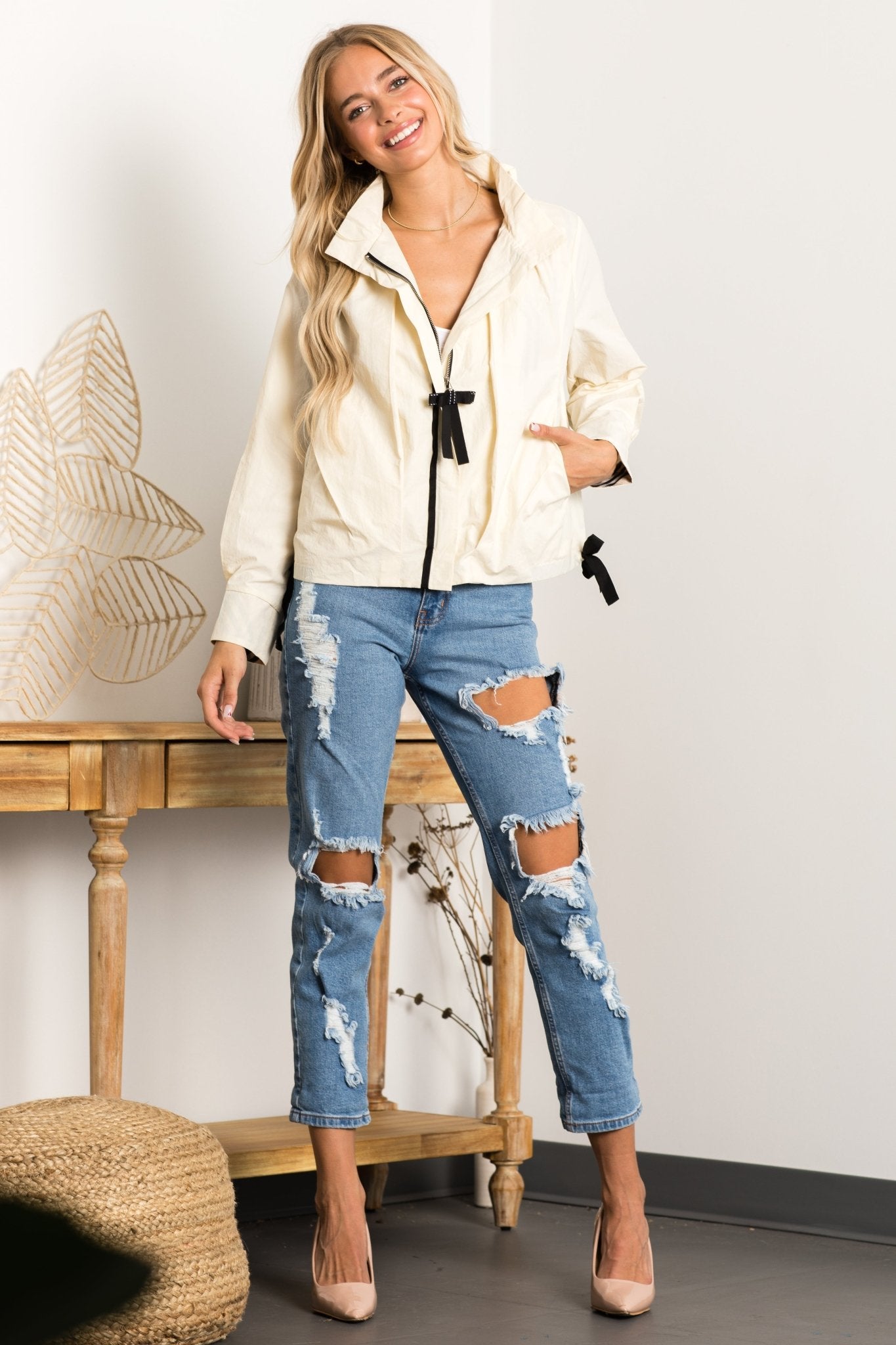 This lightweight jacket is ideal for all seasons, crafted with incredible design talent from Joh. The Jessica woven jacket features a beautifully finished inside plaid lining, a full zipper front, pockets, and charming ribbon bows. With its stylish and timeless appeal, this piece offers an easy relaxed fit, making it an unbeatable value and a must-have closet staple season after season.