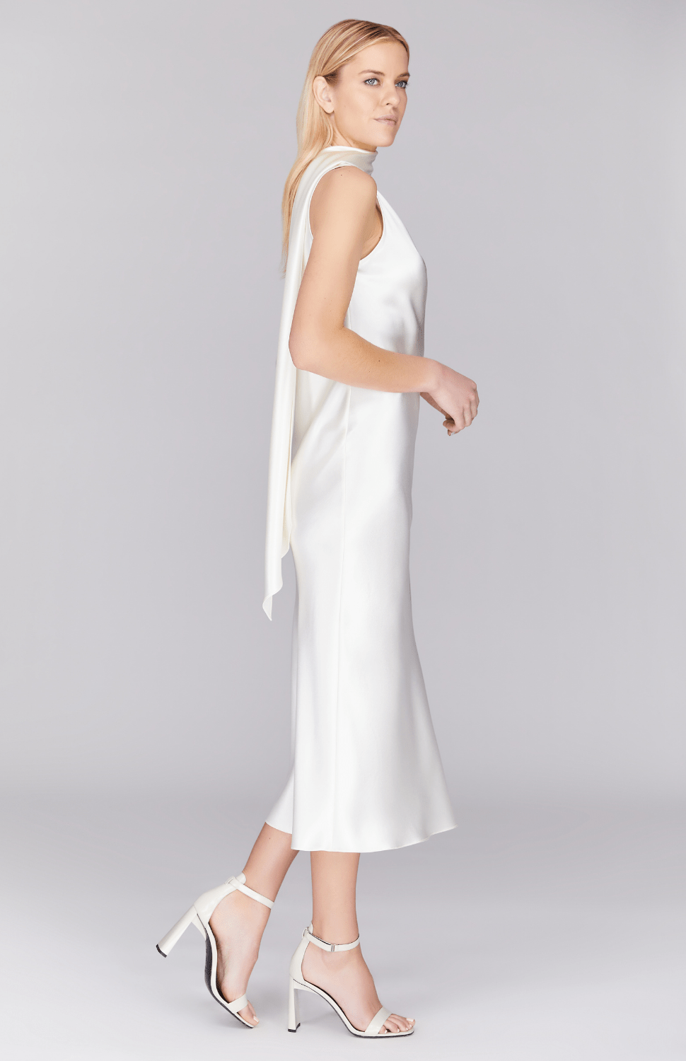 Experience the elegance of our signature one-shoulder bias cut dress, designed by the incredible Mi Jong Lee. This versatile piece features an attached scarf that can be styled loose down the back or gracefully wrapped around the neck, offering endless outfit possibilities. Crafted in a flattering midi length, it showcases a clean baby hem finish. With its unlined design and bias cut fabric, there are no closures needed, ensuring a seamless fit and exceptional comfort.